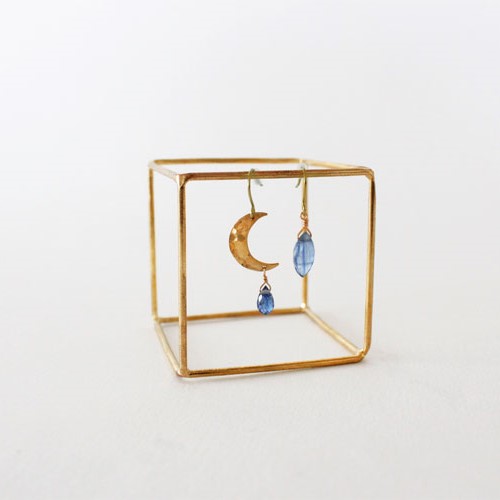 こちらは、真鍮製の月のモチーフに、しずく型のカイヤナイトを組み合わせた、左右でデザインの違うアシンメトリーな耳飾り。フォーマルからカジュアルな装いまで、幅広いシーンでお使いいただける耳飾りです。