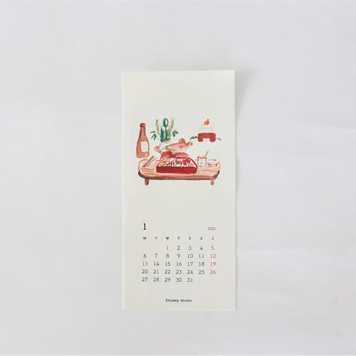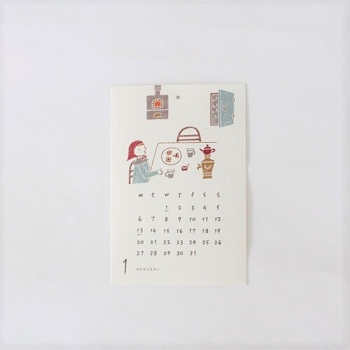 また、昨年に引き続き、山口県在住の美術家 保手濱拓さんのカレンダーや、東京在住の美術家の中村眞弥子さんのカレンダー、土絵の具を使った木版画や鉛筆で温かみのあるイラストを描く”ノラヤ”さんのカレンダーなど、手仕事を感じられるカレンダーも入荷しています。
