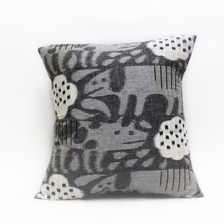 こちらは、鹿児島睦のZUAN(図案)を元に製作した久留米絣のクッションカバー。久留米絣は、福岡の筑後地方を中心に発展し200年の歴史をもつ伝統工芸。あらかじめ染め分けた糸(絣糸)を用いて製織し文様を表します。織機で織り上げられる巾を活かして、1枚の布から仕立てました。動物や植物をあしらった可愛らしい図柄が、高度な技術で織り出される久留米絣の模様として、新たに生まれた図柄。