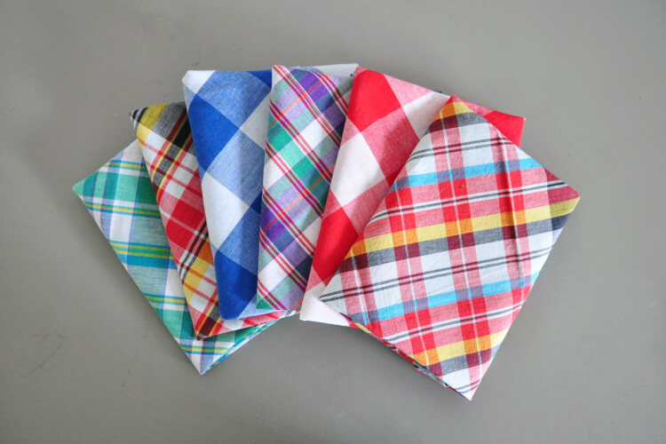 カラフルなチェックの布は、「パーカオマー」と呼ばれるタイの生活布。