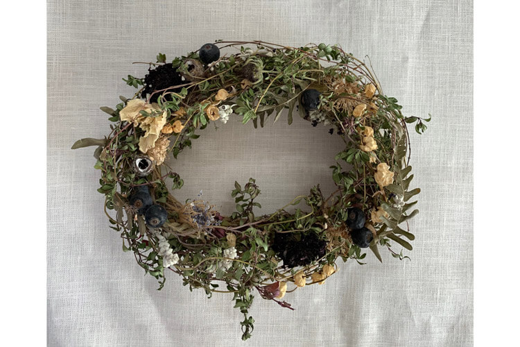 ワイヤーやグルーガンを主に使用して藁のリースベースにドライフラワーを選び、花あしらいしていただきます。