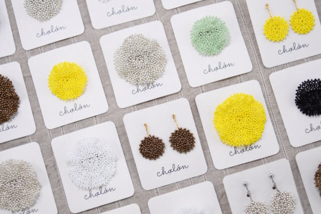 アクセサリーはオリジナルのビーズのブローチ、カレンシルバーのアクセサリーの他、タイの買い付けのカラフルなアクセサリーなど。