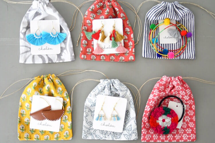 アクセサリーをお買い上げの方へは、お好きな柄のブロックプリントの巾着をお渡しいたします。