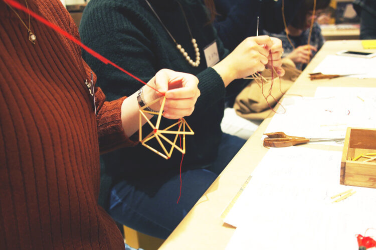今回のワークショップでは、長さを自由に組み合わせて基本の正八面体を複数作り、大小好きな大きさのものをつなげて、オリジナルのヒンメリを制作していただきます。