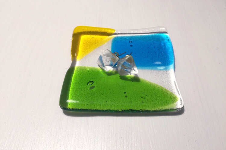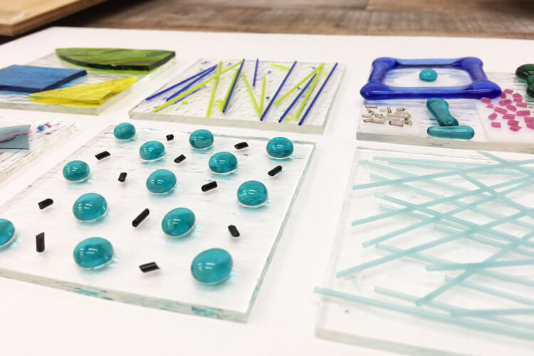 透明な板ガラスの土台の上に、細かい破片や棒状、粒状のガラスを載せてボンドで仮止めする。