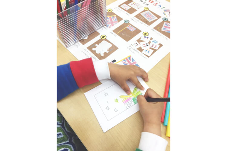 こちらでご用意させていただくシートに色えんぴつで色を塗り、切って貼って、かわいい国旗を作っていただけます。