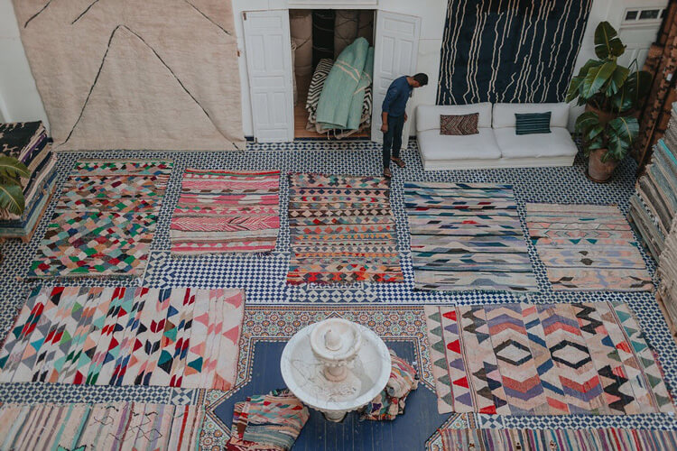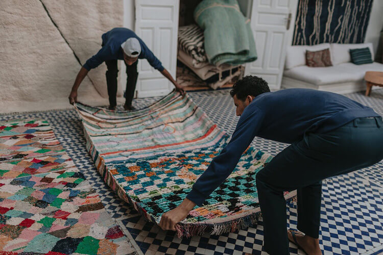 写真は昨年11月にモロッコにて、今回の展示会のためのボシャルウィットキリムを選んでいただいていただいている様子。