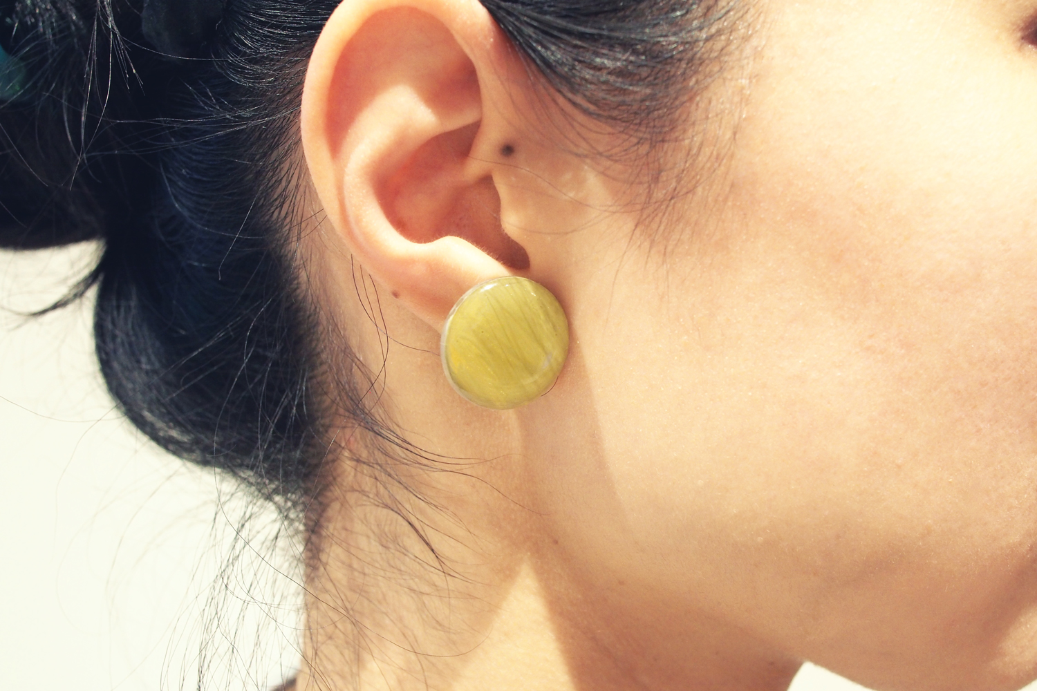 丸い形のプラバンにアクリル絵の具を使って色を塗り、レジンをのせて、ピアスかイヤリングに仕上げます。