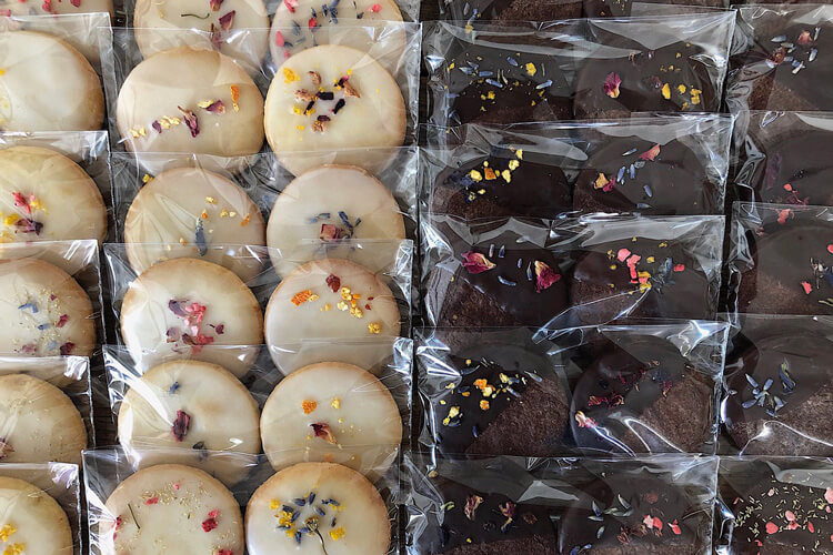 エディブルフラワーとドライフルーツを散らした華やかなクッキー(柚子/チョコレート)と、焼き菓子の詰め合わせをお作りいただきました。