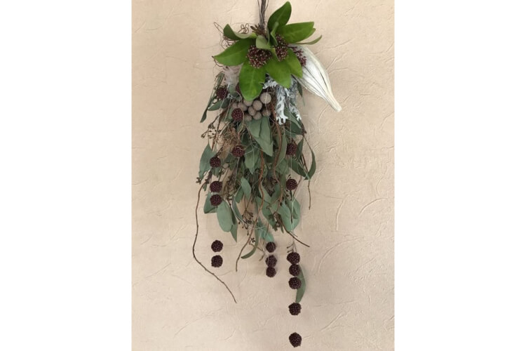 ユーカリをメインに、ドライの花材を使用し、季節を問わず飾っていただけるシンプルなスワッグを制作します。